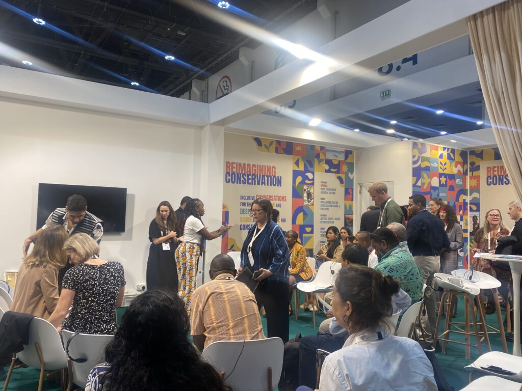 Having made that disclaimer, and acknowledging that it was not humanly possible to attend most events, finding one’s space was crucial. Even so, key trends emerged throughout the WCC program. Some of these revolved around finance and technology for conservation, and how these could converge inclusively. Technical approaches to achieve this convergence were mainstreamed across different halls and pavilions, but often remained separated from one another, attracting specific audiences clustered by geography, language, sector, or affiliation. This also meant that participants were often surrounded by like-minded people in terms of how they conceptualized conservation, instead of discussing fundamental differences. It was difficult to find spaces dedicated to conversations from different worldviews in a clear and direct way outside of the Reimagining Conservation Pavilion, a space hosted by the IUCN´s Commission on Environmental, Economic, and Social Policy (CEESP) in collaboration with diverse partners, including CONDJUST. Spaces for crossing over different perspectives and seeking to challenge the status quo were not necessarily at the center stage.