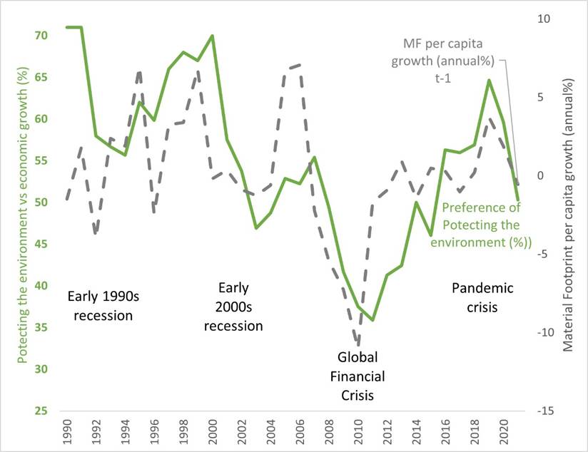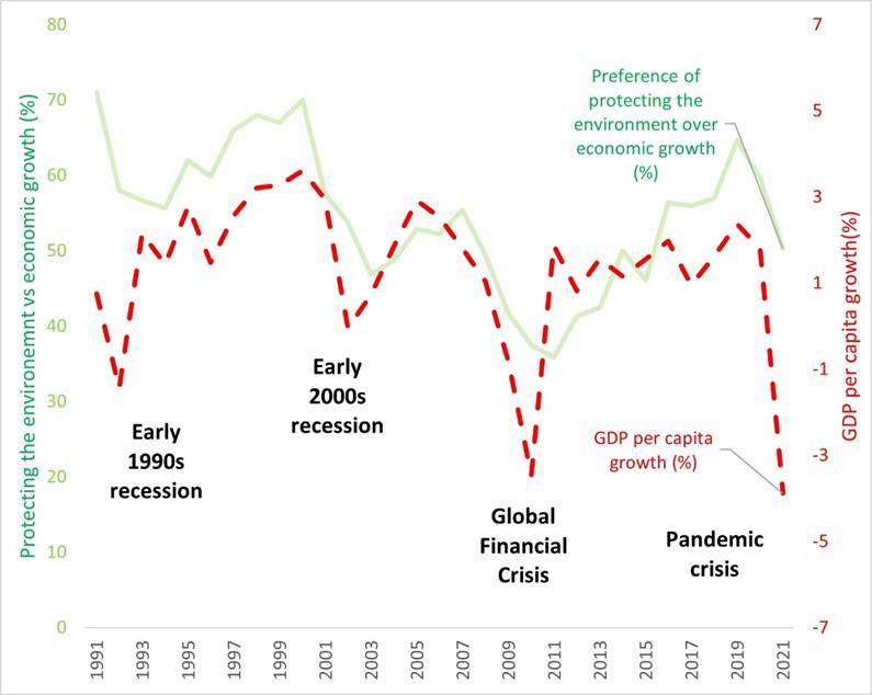 In our previous blog, we examined how different income groups relate to environmental protection, uncovering surprising patterns in environmental consciousness and carbon footprints across wealth levels. Now, turning from these income disparities to aggregate time-series data, we explore how economic cycles shape environmental awareness at the societal level and reveal another dimension of the environmental paradox: that environmental concern becomes structurally detached from its material consequences.