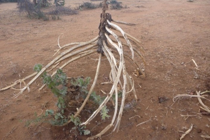 Euphorbia bussei species located behind fences which exclude elephants (top) and a recently toppled individual (bottom).