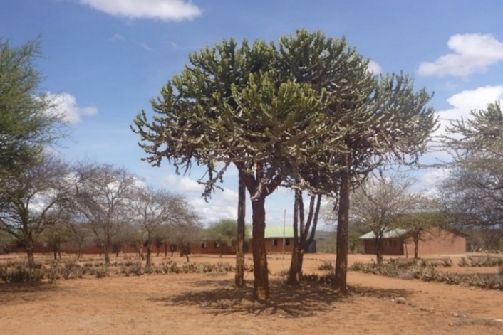 Area of formerly very dense Euphorbia tirucalli forest (left) today supporting dense perennial grasses, mixed forbs and shrubs, and much more sparse canopies (right).