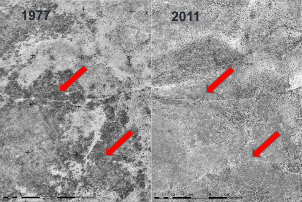 We found no reason to believe that patterns of widespread tree losses could have been caused by livestock. Historical remote-sensing showed that tree-sized Euphorbia bussei had been lost across the extent of Koija, and as experts told us, probably due to elephants. Another, Euphorbia tirucali, which formerly was the key species in the large contiguous forest that had disappeared, seems most likely to have been extirpated due to climate change. Patterns of woody plant encroachment, rather than being driven by livestock, as often assumed, showed no associations with livestock use intensity. Their dramatic increase in specific areas with distinct soils and topography indicated that the patterns are more likely explained by a combination of climatic change and fire suppression. We found that patterns of decreases in herbaceous vegetation that deviated from what we would expect based on rainfall were mostly associated with increases in temperature since the 1980s. However, this pattern especially stood out in areas where conservation interventions had imposed a sedentarization policy AND where trees had been lost. That is, changes in herbaceous vegetation near settlements were also highly contingent on historical loss of trees, likely due to cascading influences on ecosystems caused by canopy losses. In short, we found that widespread landscape vegetation changes were more likely explained by a combination of climate, elephants, fire supression, and sedentarization policies rather than pastoralism per se.